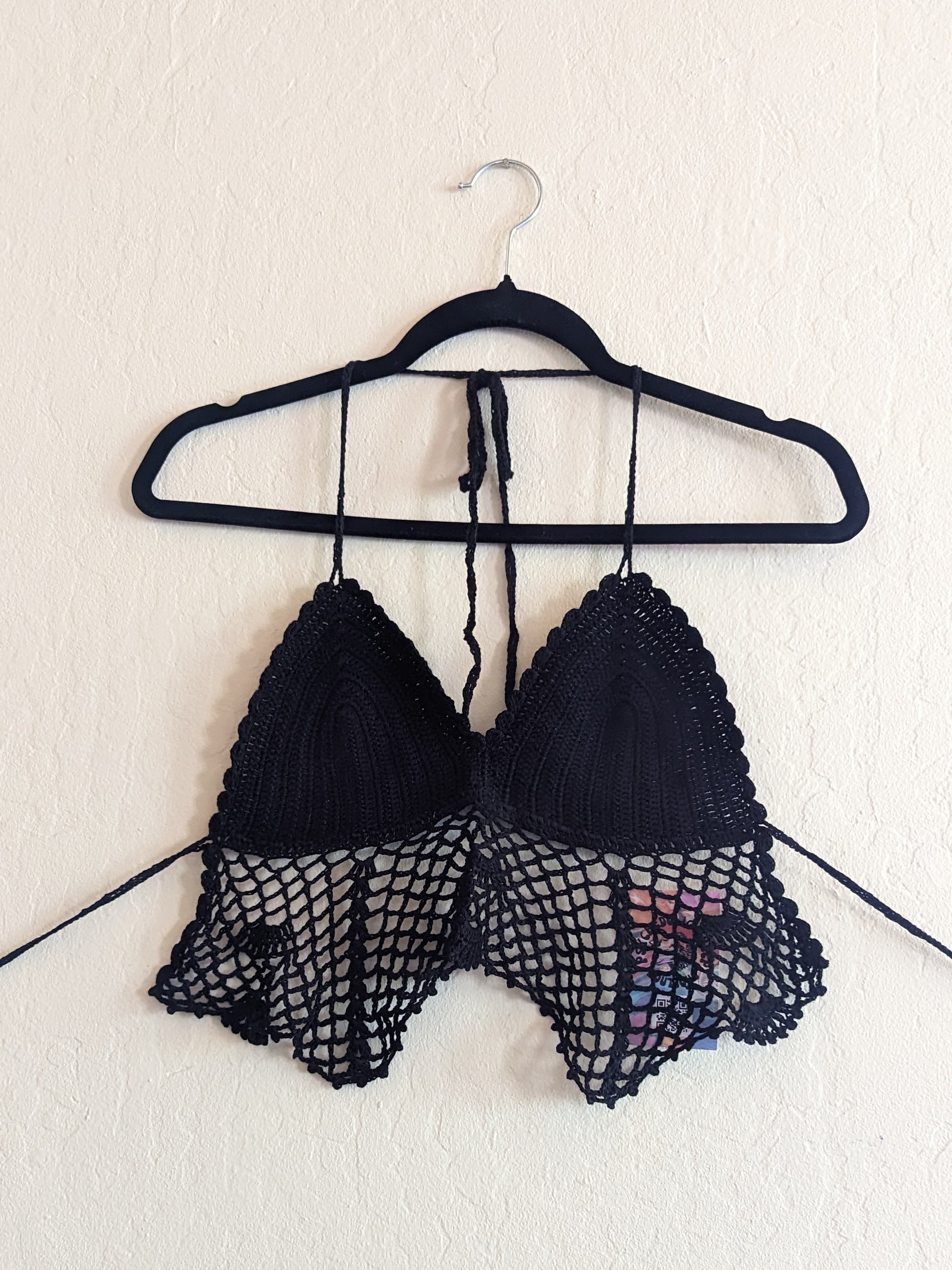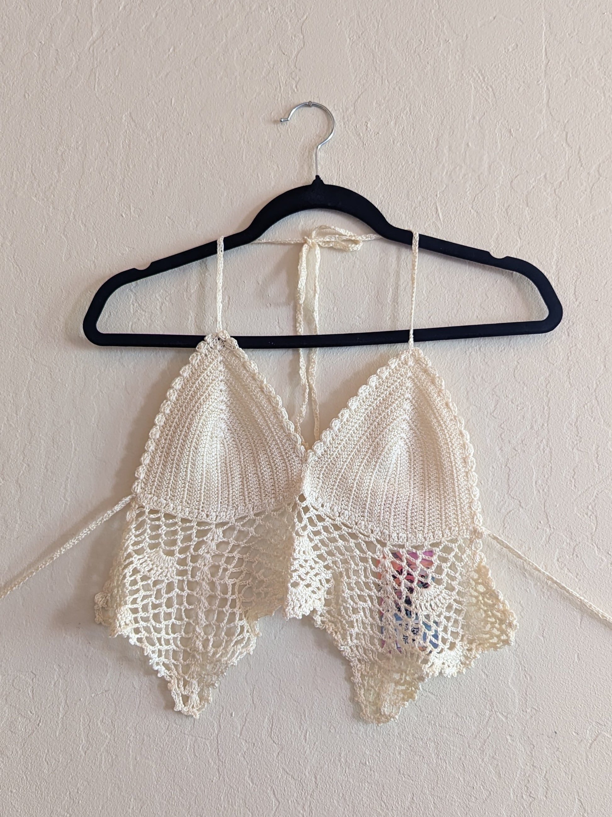 Crochet halter top with adjustable straps, a midriff crop, and flowy fringe.