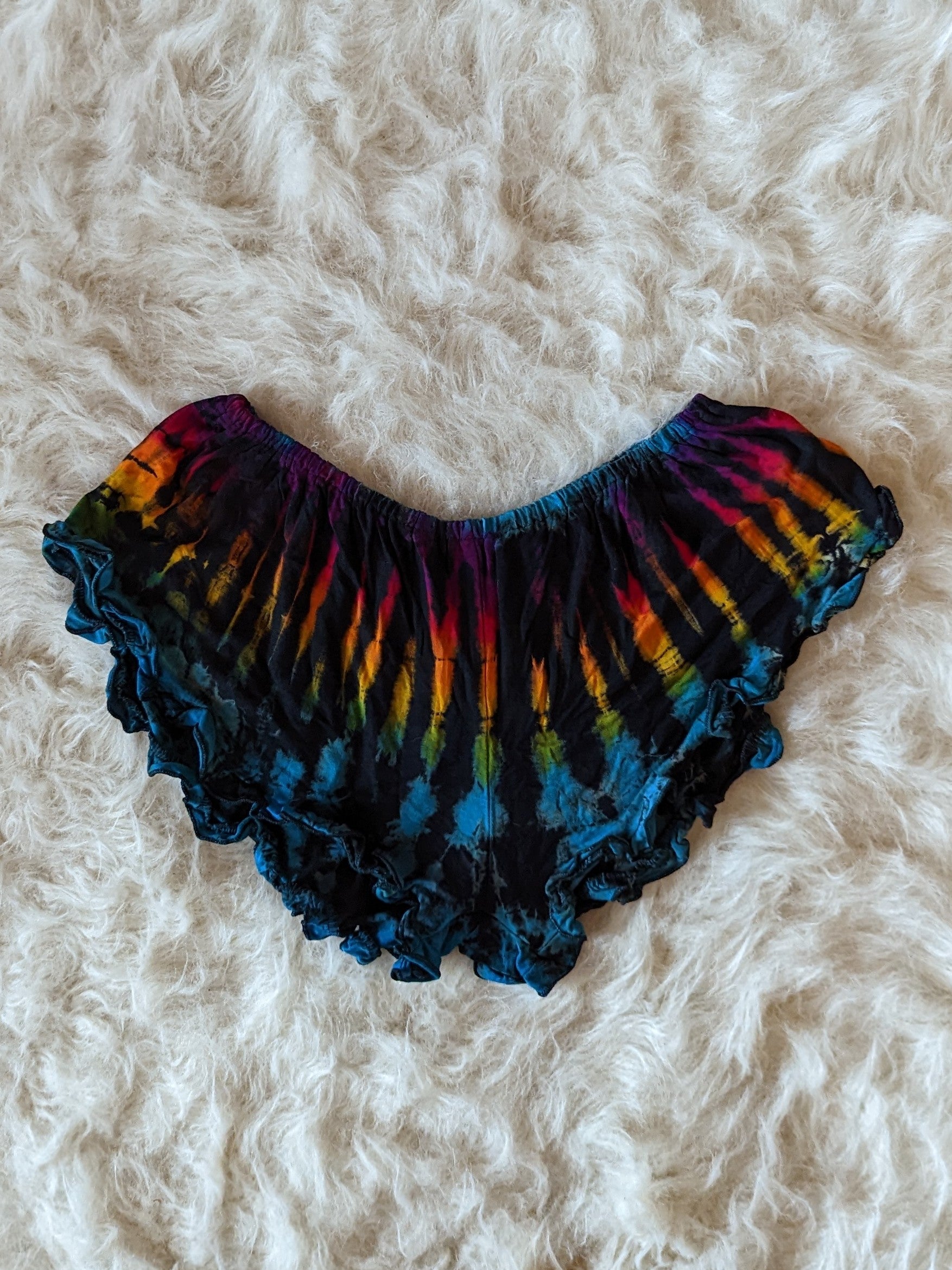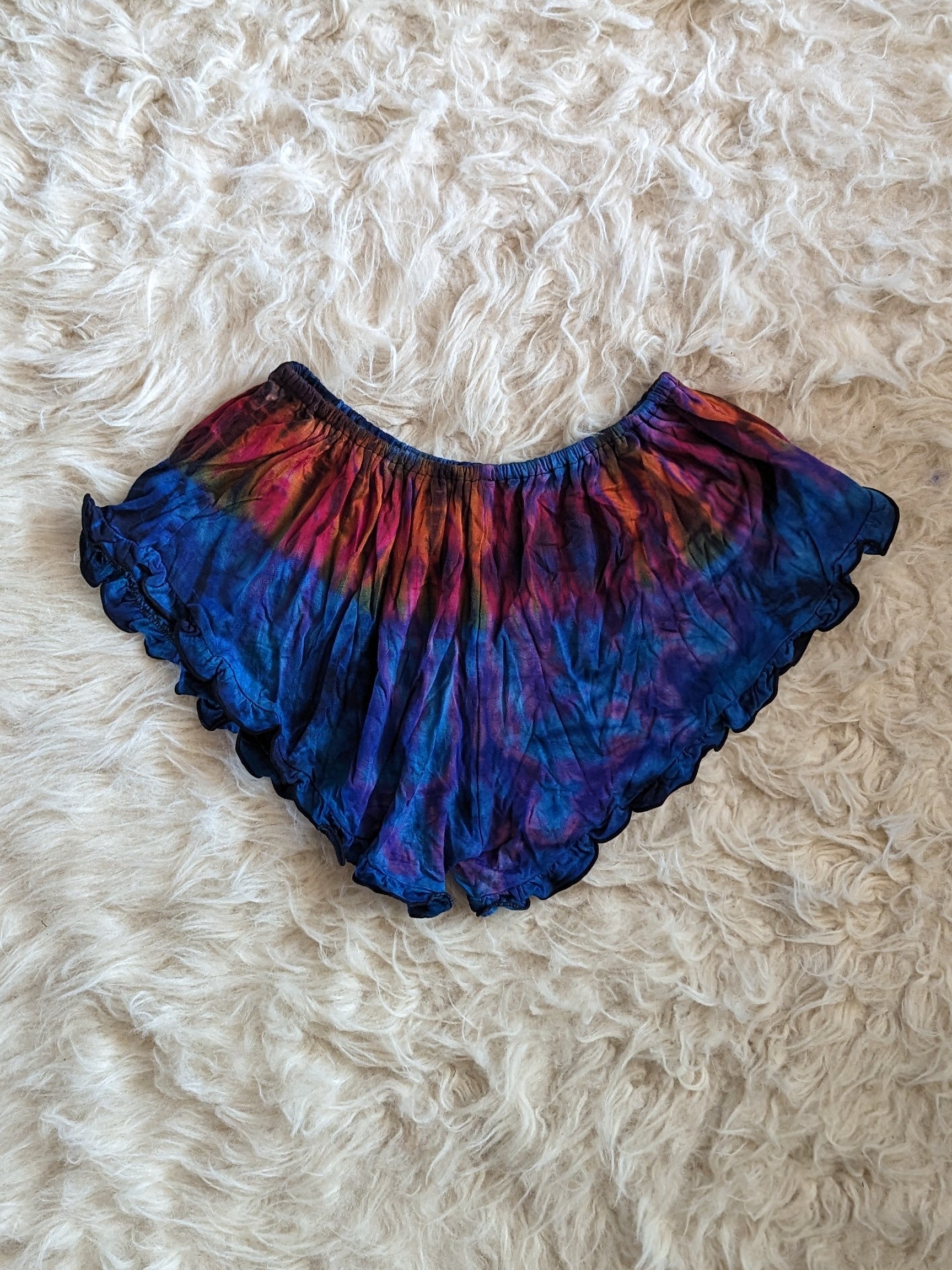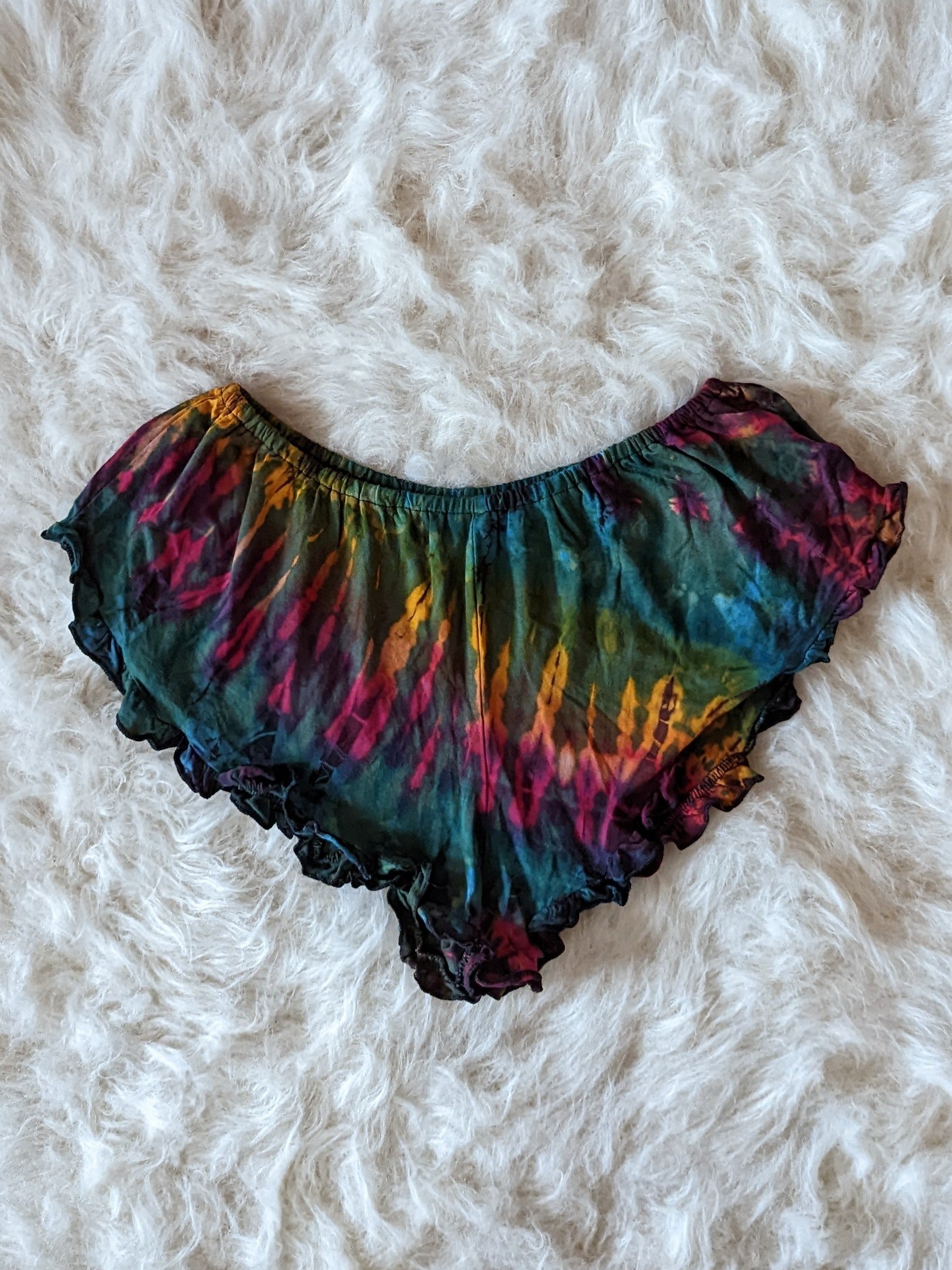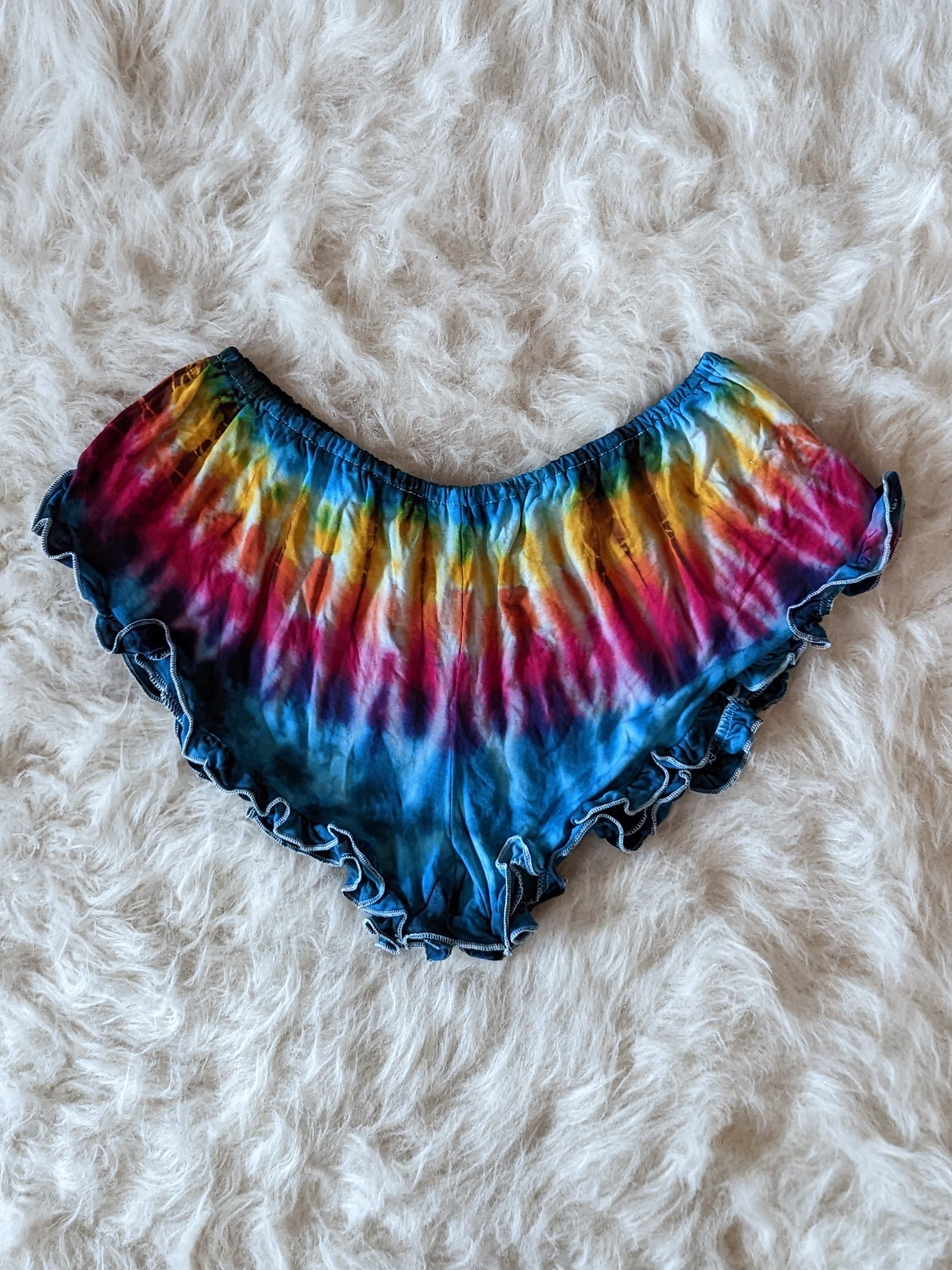 Tie dye booty shorts with a ruffle trim